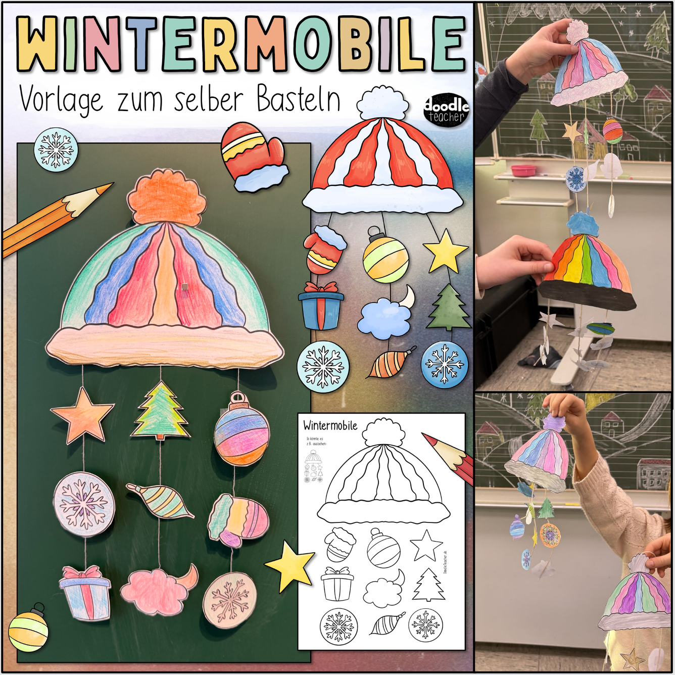 Suchbegriffe: Winterbasteln, Mobile basteln, Winterdeko, Bastelvorlage Kinder, Fensterdeko Winter, Ausmalbild Winter, Grundschule, Kreatives Gestalten, Doodleteacher