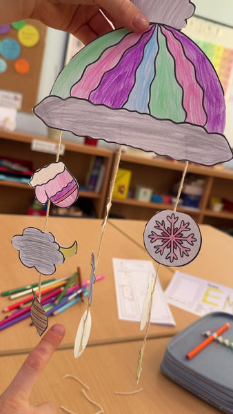 Kreative Winteridee für Schule und Zuhause! Kinder gestalten ein Wintermobile mit Mütze, Schneeflocken, Stern, Tannenbaum und weiteren winterlichen Symbolen. Perfekt für den Kunstunterricht, Vertretungsstunden oder als Fensterdeko in der kalten Jahreszeit.