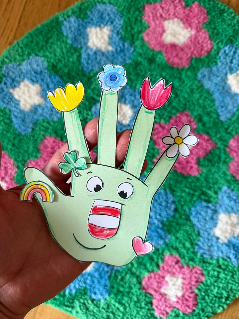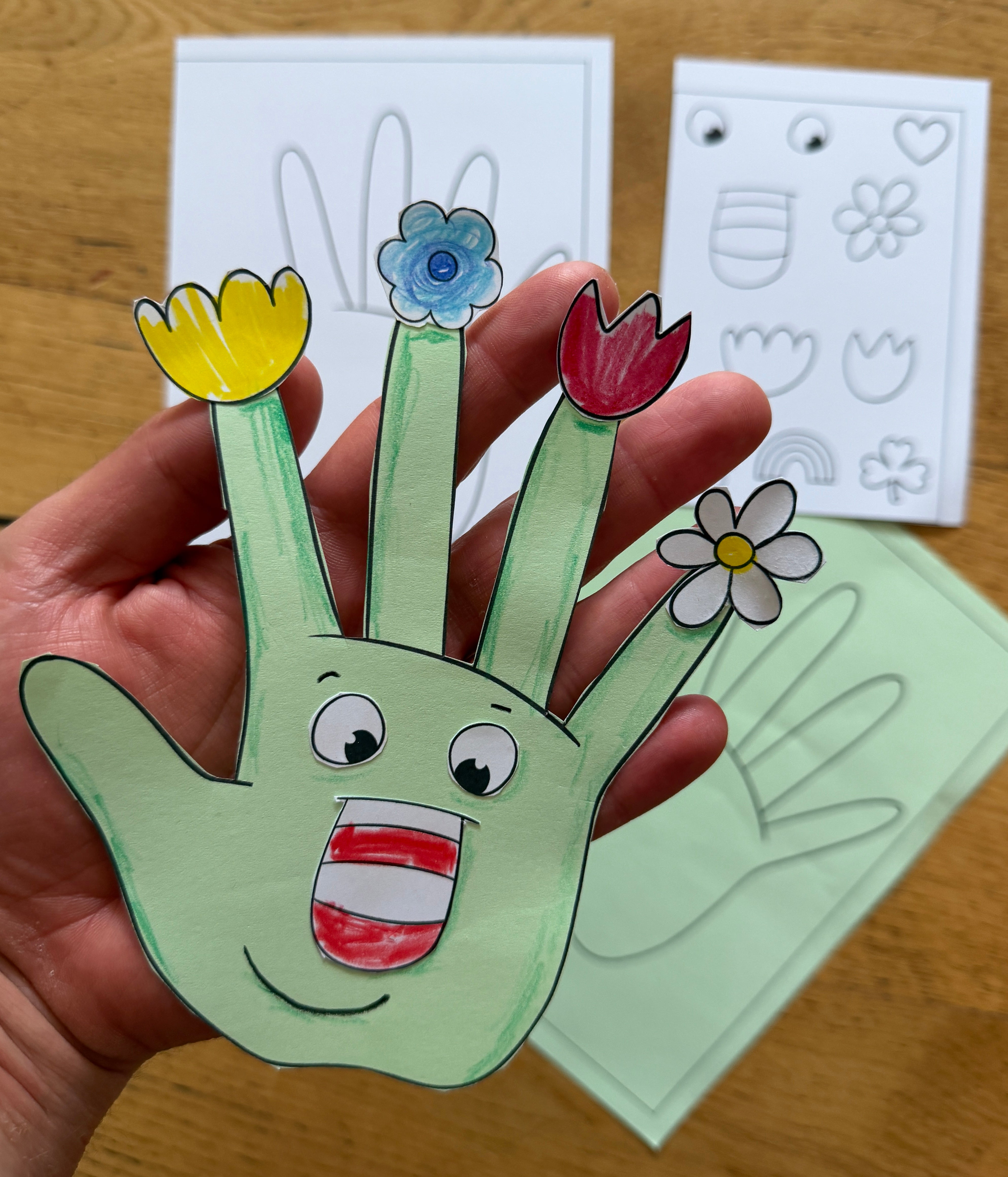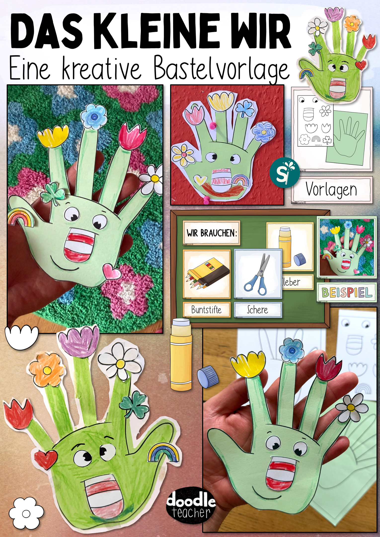 Mit dieser Vorlage basteln die Kinder ihr eigenes kleines WIR und gestalten es ganz individuell. Die Hand kann auf weißem oder farbigem Papier (z. B. grün) ausgedruckt oder selbst nachgezeichnet werden. Danach werden die übrigen Teile bemalt, ausgeschnitten und zusammengefügt – so entsteht ein persönliches WIR, das in der Klasse aufgehängt oder als Einzelarbeit gestaltet werden kann.