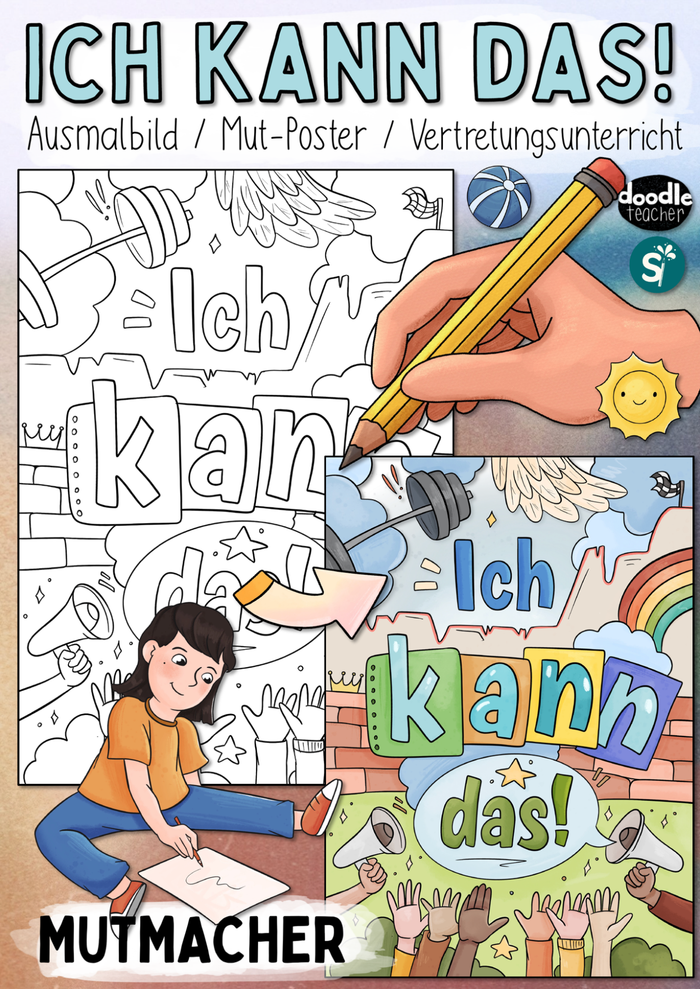 Ein kraftvoller Mutmacher fürs Klassenzimmer: Das Poster „Ich kann das!“ gibt Schüler*innen eine klare, positive Botschaft mit auf den Weg. Enthalten sind eine bunte Version und eine Ausmalversion in Schwarz-Weiß, jeweils in mehreren Größen. So eignet sich das Material als große Wanddekoration, kleine Mutmachkarte oder kreative Gestaltungsidee zum Ausmalen.